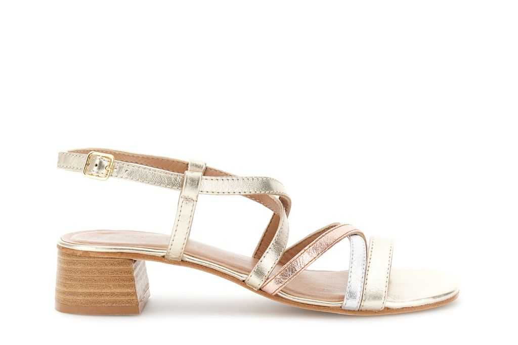 Sandali in pelle con tacco largo alto 4 cm e design a listini intrecciati multicolor impreziositi da dettagli metallici. calzatura dalla linea femminile ma decisa cinturino regolabile e calzata stabile perfetta per dare carattere ai look di tutti i giorni.
