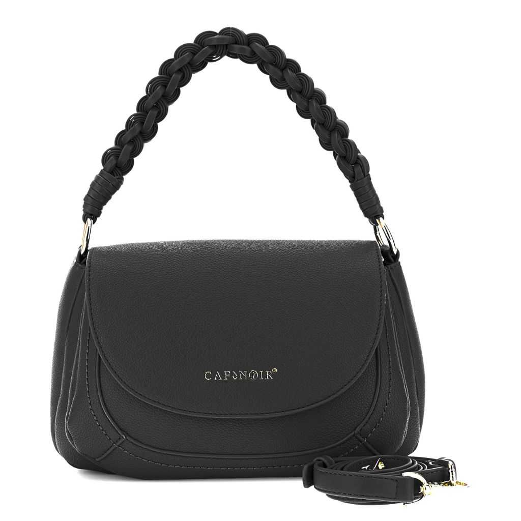 borsa a mano con pattina effetto pelle con grana e manico intrecciato nero
