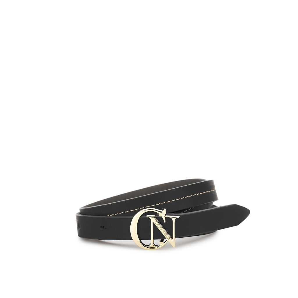 Cintura da donna in vera pelle con fibbia logata in metallo e cucitura a contrasto