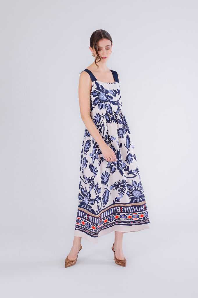 Abito lungo smanicato in marocain di viscosa stampato leggero e fluido. linea femminile con spalline larghe e fantasia raffinata ideale per look estivi eleganti vacanze e occasioni speciali. la modella è alta 171 cm e indossa la taglia s. vestibilità: regular.