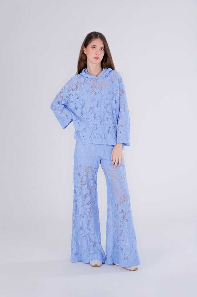 blusa con cappuccio in pizzo celeste