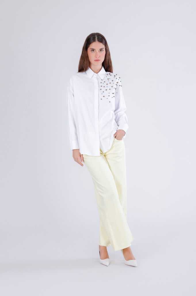 Camicia dritta tipo uomo in oxford di cotone dal design pulito e moderno. l’applicazione a pioggia di strass e borchie sul davanti destro dona luce e carattere. elegante versatile e femminile. la modella è alta 175 cm e indossa la taglia s. vestibilità: regular.