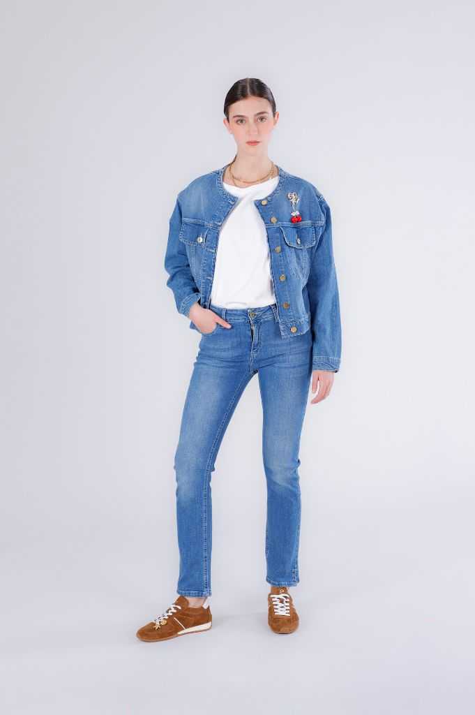 Giubbino in jeans senza colletto realizzato in tela denim comfort dal design pulito e moderno. linea versatile con bottoni metallici e tasche frontali perfetto per look casual e urbani in ogni stagione. la modella è alta 171 cm e indossa la taglia s. vestibilità: regular.