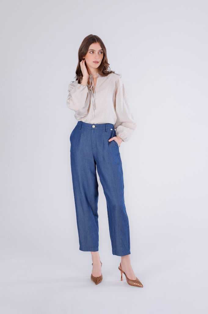 pantaloni cocoon in tencel denim indaco