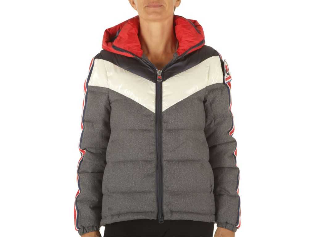 Imbottitura interna sintetica. Imbottitura: 100% Poliestere. Composizione :100% poliestere. Logo gommato sul braccio sinistro. Bande laterali a contrasto. All’interno sono state inserite delle bretelle personalizzate che permettono di indossare il capo come se fosse uno zaino. Chiusura a zip con logo. 2 tasche con zip. Cappuccio. ATTENZIONE: La modella è alta 1.73 e indossa una taglia M.