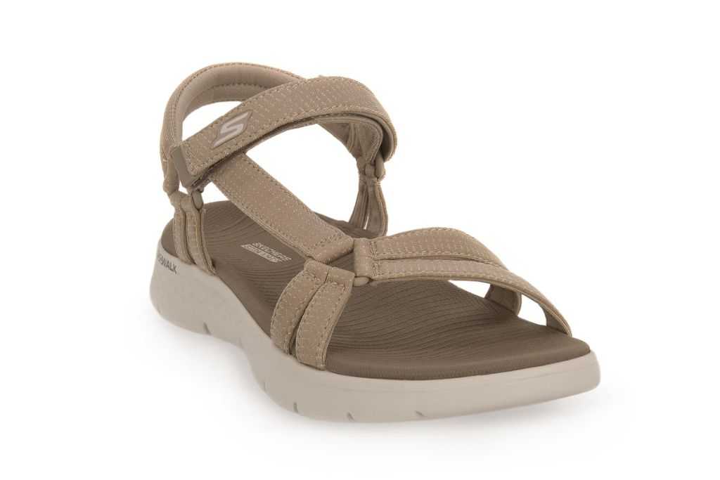 Sandali con la tomaia in morbida pelle sintetica e morbido tessuto elasticizzato con cinturino regolabile sul tallone e plantare imbottito Skechers Memory Foam™. Vegan 100%. Lavabile in lavatrice. Logo Skechers. Colore: Taupe.