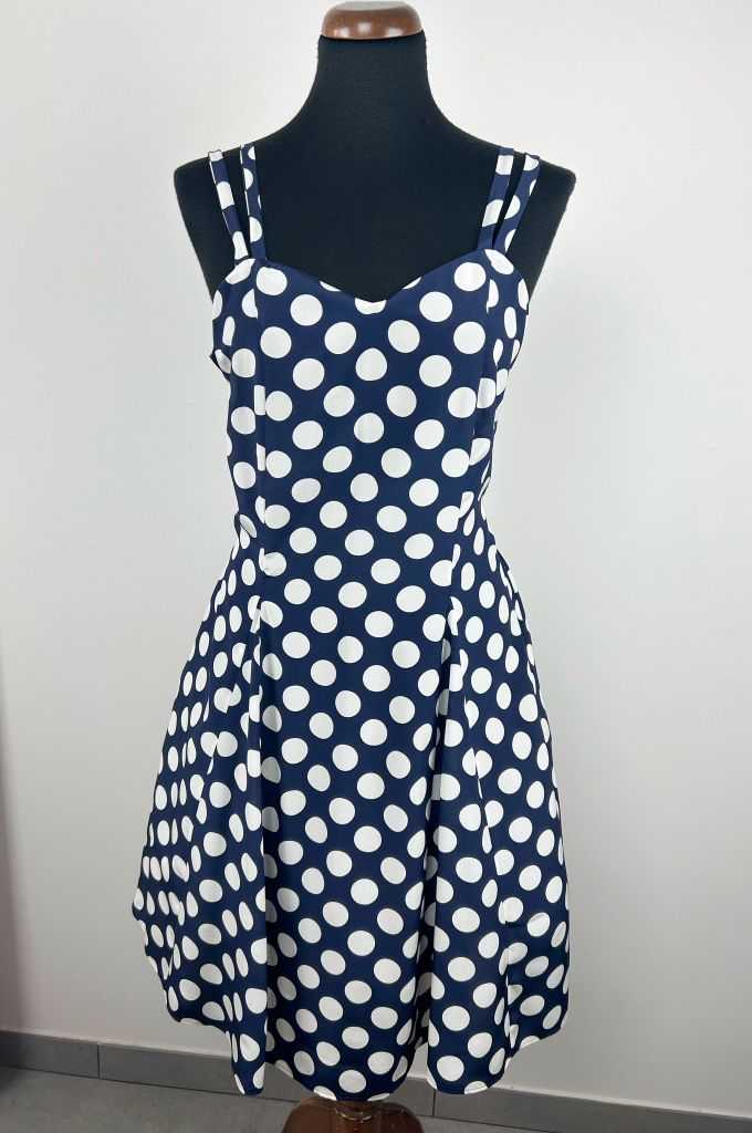 Un elegante abito da donna in seta ispirato allo stile di "Grease", con bretelle sottili. Il tessuto è caratterizzato da un motivo a pois bianchi su uno sfondo blu profondo. La parte inferiore dell'abito è ampia e voluminosa, grazie all'inserto di tulle che dona un tocco di sofisticata leggerezza e movimento al capo. Il design richiama un'epoca di glamour e femminilità, perfetto per una serata speciale o un evento formale