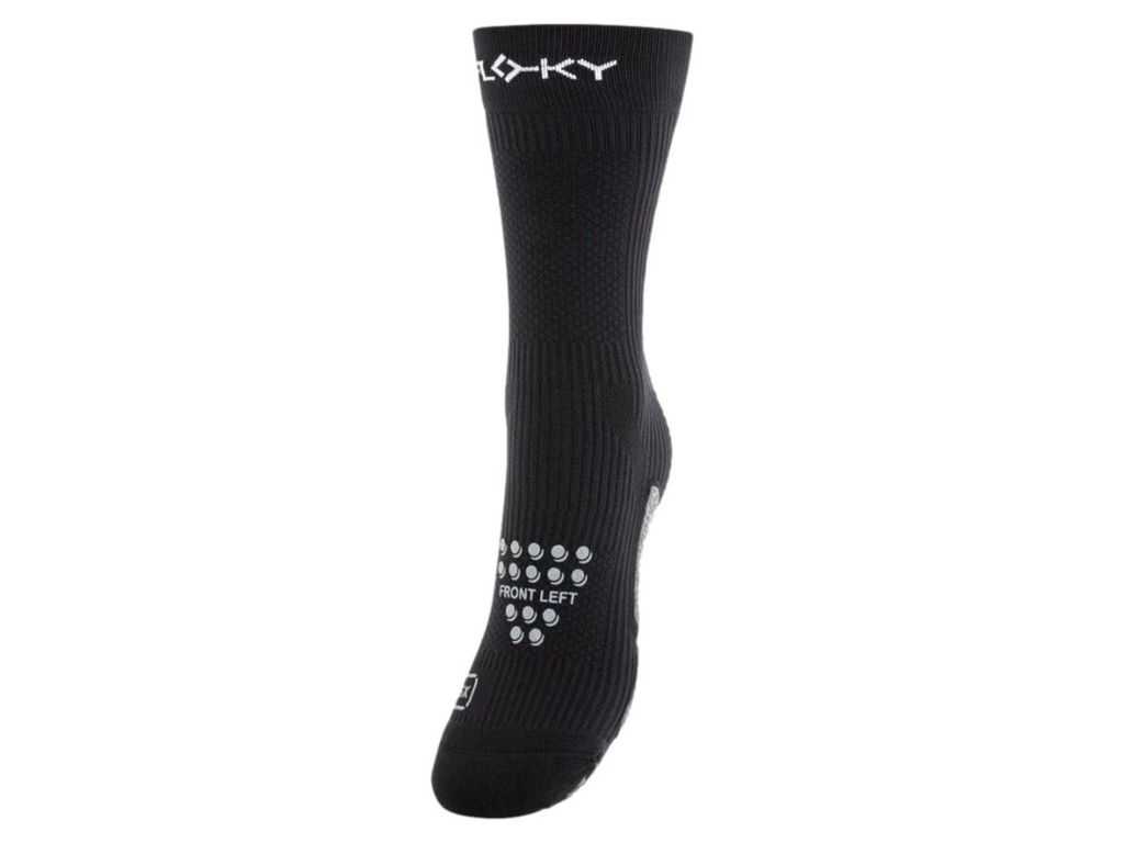 La stampa antiscivolo è realizzata per aumentare l'aderenza alla scarpa, riducendo il rischio di storte e aumentando la propriocezione. Le applicazioni serigrafiche laterali sono studiate per sostenere il quinto metatarso migliorando la postura durante la corsa. Il Tape System riduce la vibrazione e preserva il tendine d'Achille da possibili microtraumi. Allo stesso tempo i micro-fori aiutano l'espulsione della sudorazione. Gli spessori distribuiti sulla pianta riproducono l'elica podalica favorendo la movimentazione del piede e il miglioramento della performance. La fascia sulla pianta del piede agisce con una compressione localizzata sulla soletta di Lejars favorendo il ritorno venoso e riducendo l'affaticamento. La costruzione della calza senza il tallone, unita al Tape System favorisce lo scarico e garantisce un senso di spinta. Il filato utilizzato deriva dal riciclo dei tessuti, contribuendo all'economia circolare e alla salvaguardia dell'ambiente.