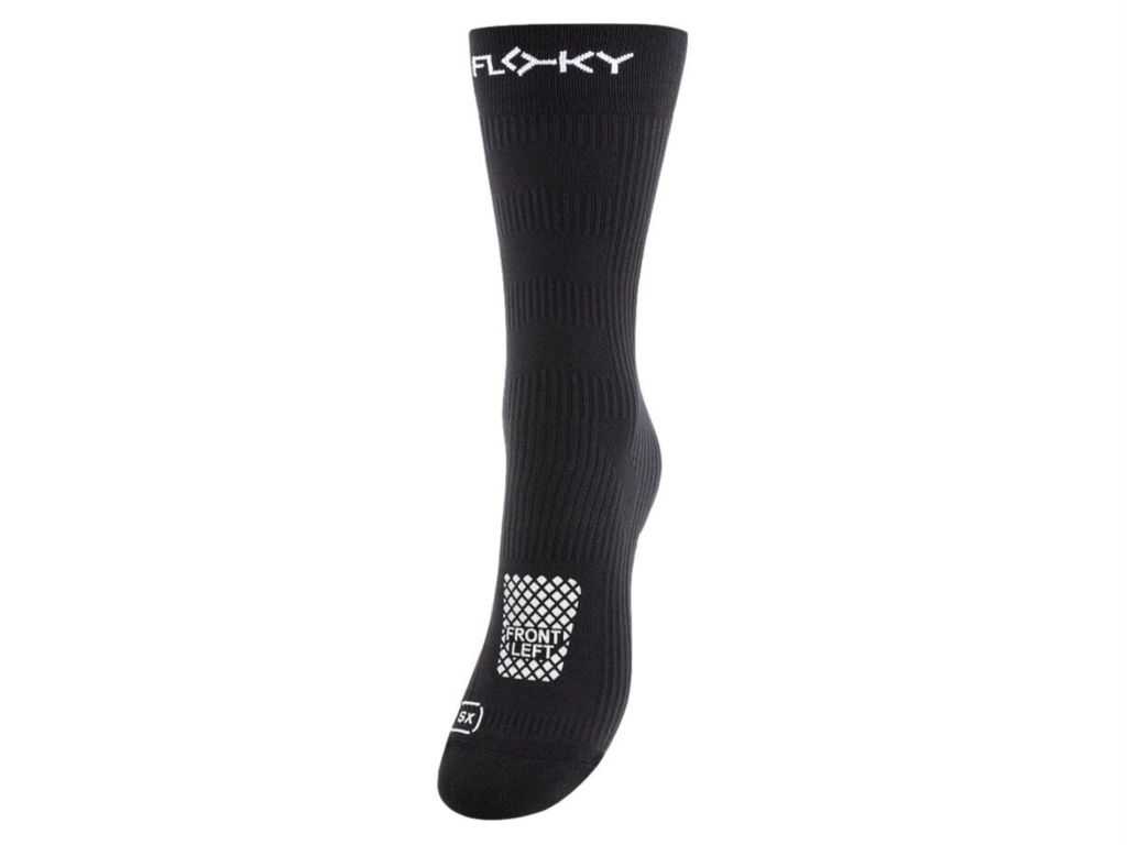 La stampa antiscivolo è realizzata per aumentare l'aderenza alla scarpa, riducendo il rischio di storte e aumentando la propriocezione. Le applicazioni serigrafiche laterali sono studiate per sostenere il quinto metatarso migliorando la postura durante la corsa. Il Tape System riduce la vibrazione e preserva il tendine d'Achille da possibili microtraumi. Allo stesso tempo i micro-fori aiutano l'espulsione della sudorazione. Gli spessori distribuiti sulla pianta riproducono l'elica podalica favorendo la movimentazione del piede e il miglioramento della performance. La fascia sulla pianta del piede agisce con una compressione localizzata sulla soletta di Lejars favorendo il ritorno venoso e riducendo l'affaticamento. La costruzione della calza senza il tallone, unita al Tape System favorisce lo scarico e garantisce un senso di spinta. Il filato utilizzato deriva dal riciclo dei tessuti, contribuendo all'economia circolare e alla salvaguardia dell'ambiente.