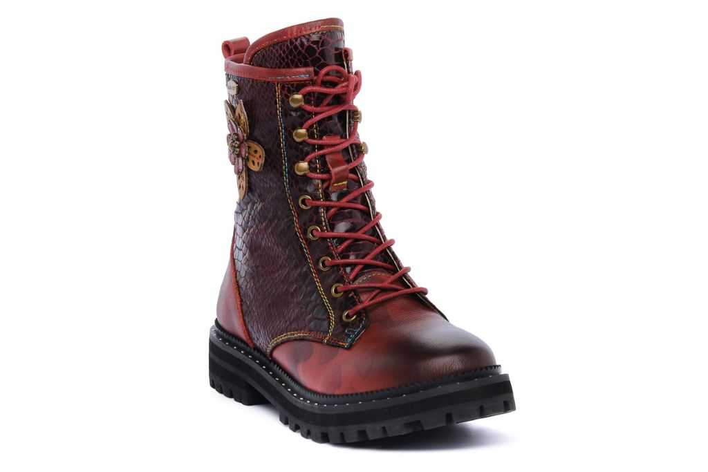 Stivaletti con la tomaia in pelle stampata e fodera in tessuto. Anfibi Laura Vita con lacci e zip laterale, suola in gomma. Colore: Rosso Bordeaux.