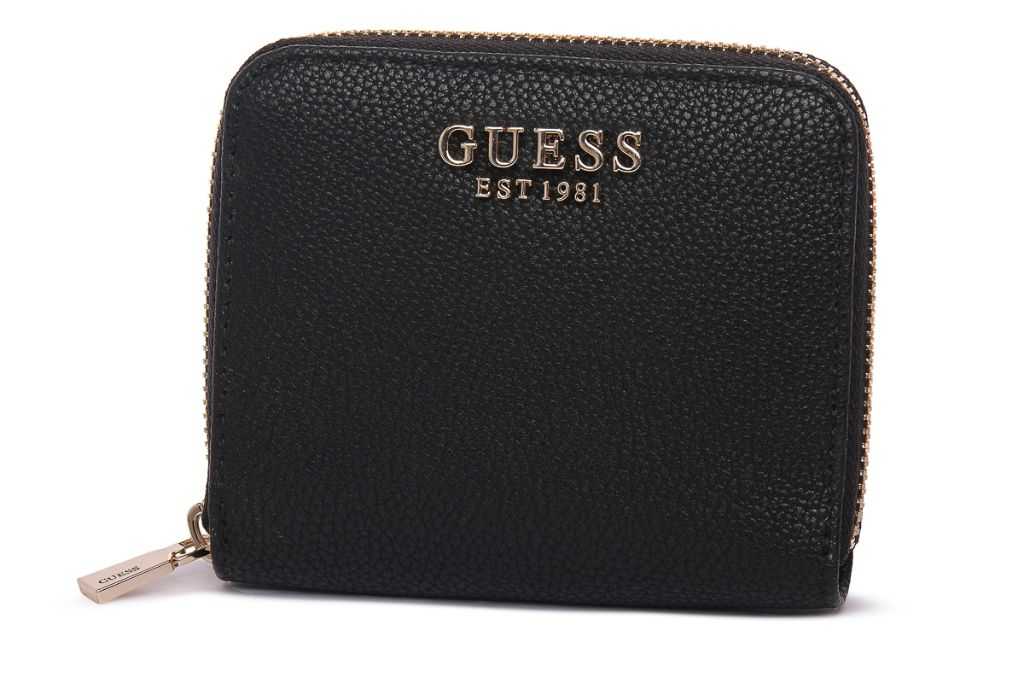 Portafoglio in ecopelle piccolo con scomparto chiuso con cerniera. Slot per carte di credito. Logo Guess in metallo frontale. Misure 11 x 9 x 3 cm. Colore: Nero.