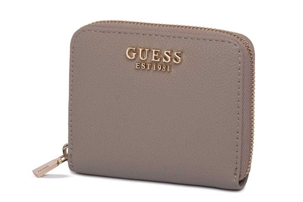 Portafoglio picoolo Laurel con scomparto chiuso con cerniera. Slot per carte di credito. Portamonete interno con bottone. Logo Guess in metallo frontale. Misure 11 x 9 x 3 cm. Colore: Taupe scuro.