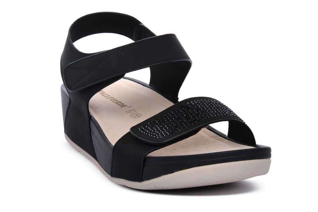 Sandalo comfort con strass e sottopiede in pelle. Sandalo Valleverde con la chiusura con velcro regolabile. Zeppa alta 4 cm. Colore: Nero.