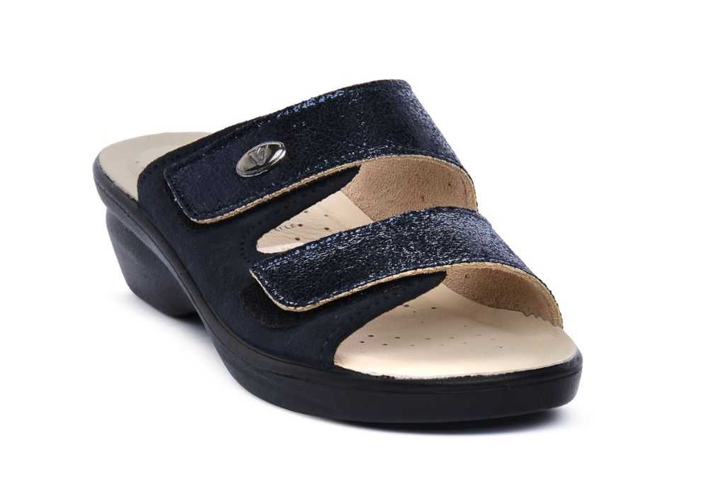 Ciabatta comfort con doppia chiusura regolabile con velcro, sottopiede in pelle. Ciabatta Valleverde realizzata con pelle di alta qualità in Italia. Zeppa alta 4 cm. Colore: Blu.