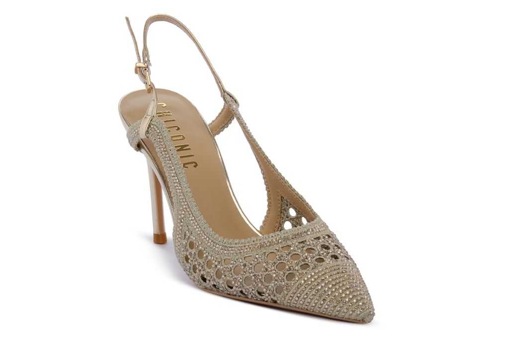 Decolletè slingback Chiconic in tessuto traforato da indossare per dare sempre un tocco di stile ed eleganza al proprio outfit. La collezione Chiconic by Uma Parker è la nuova linea di decolletè dal design chic ed iconico. Tacco alto 9 cm. Colore: Oro.