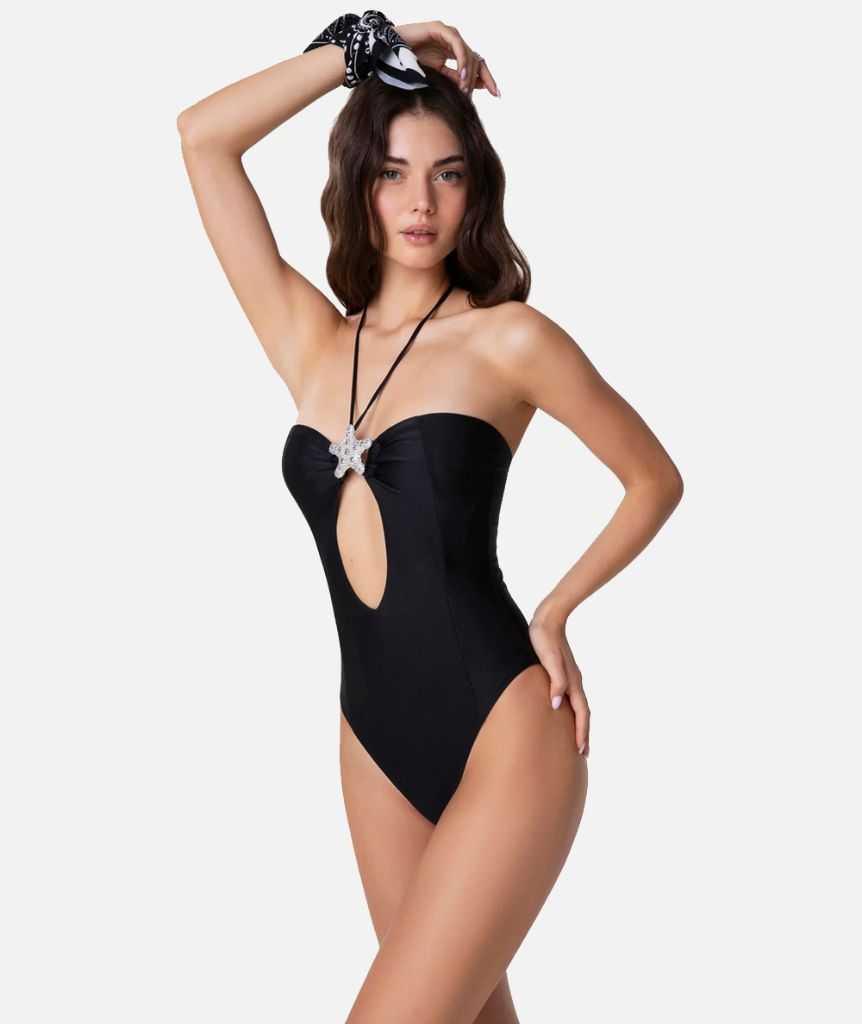 Monokini nero con scollo a V e accessorio centro seno in tessuto lycra lucida; capo dotato di imbottitura interna estraibile.