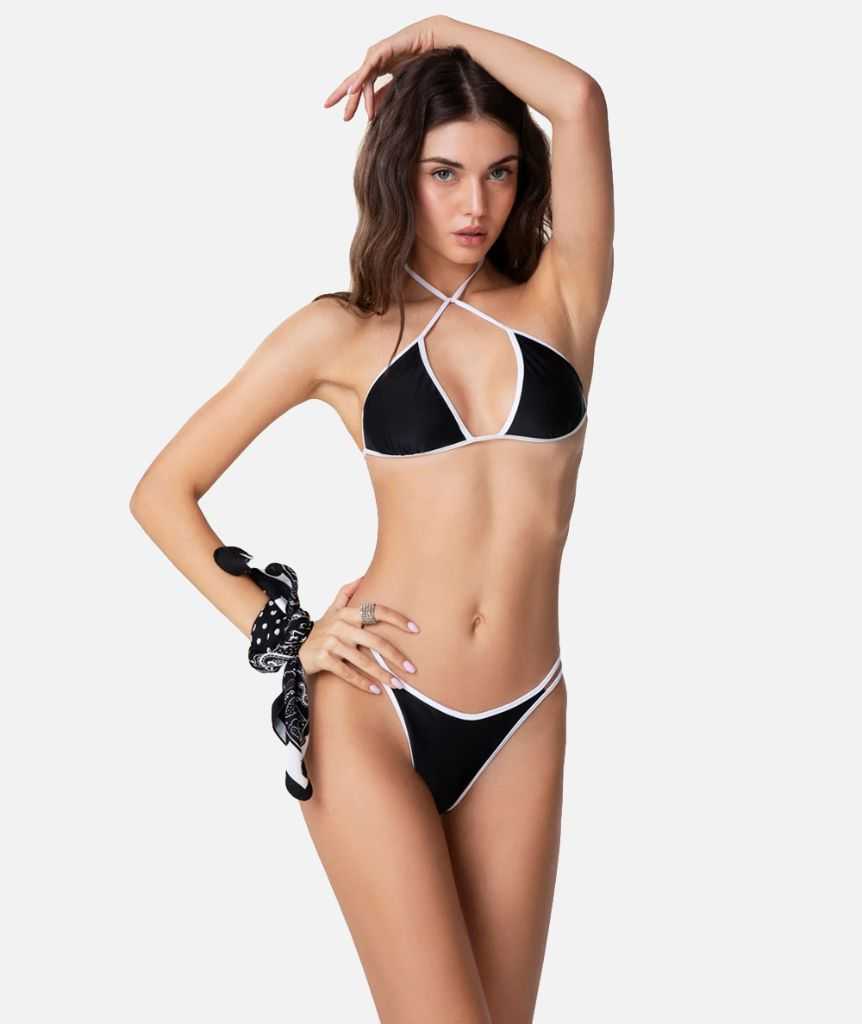 Bikini triangolo con slip americano fisso in tessuto lycra opaca nera, con bordatura in lycra bianca.