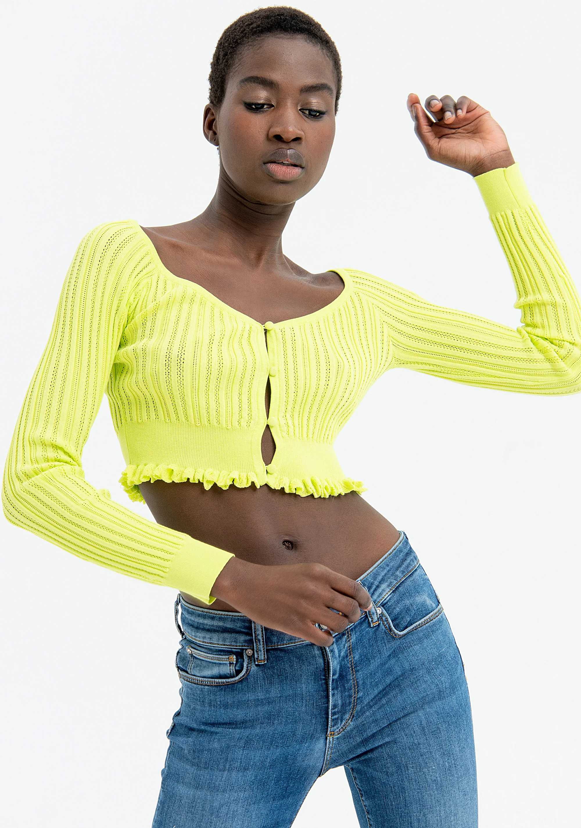 Cardigan slim cropped, scollo a V, bottoni centrali per apertura, rouches sul fondo, e con maniche lunghe.