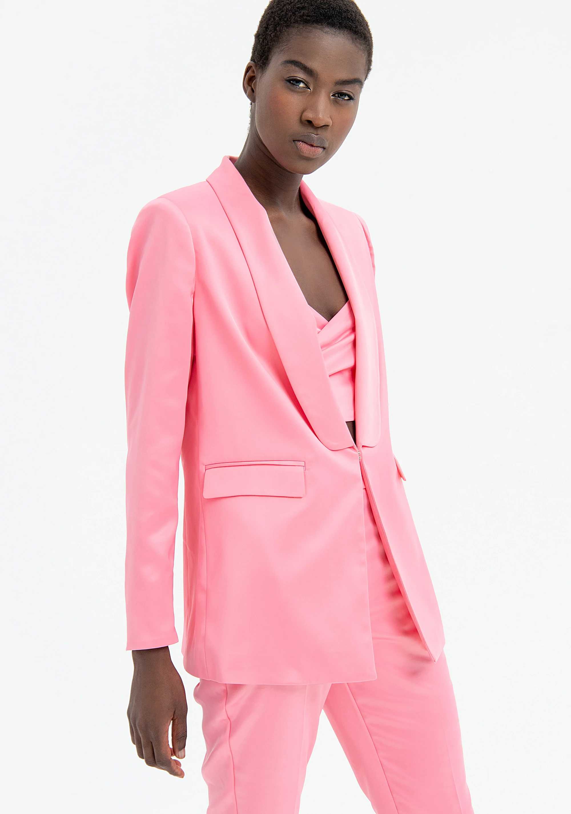 Blazer slim monopetto in raso, revers sciallato, gancio centrale per apertura, tasche laterali, e con maniche lunghe.