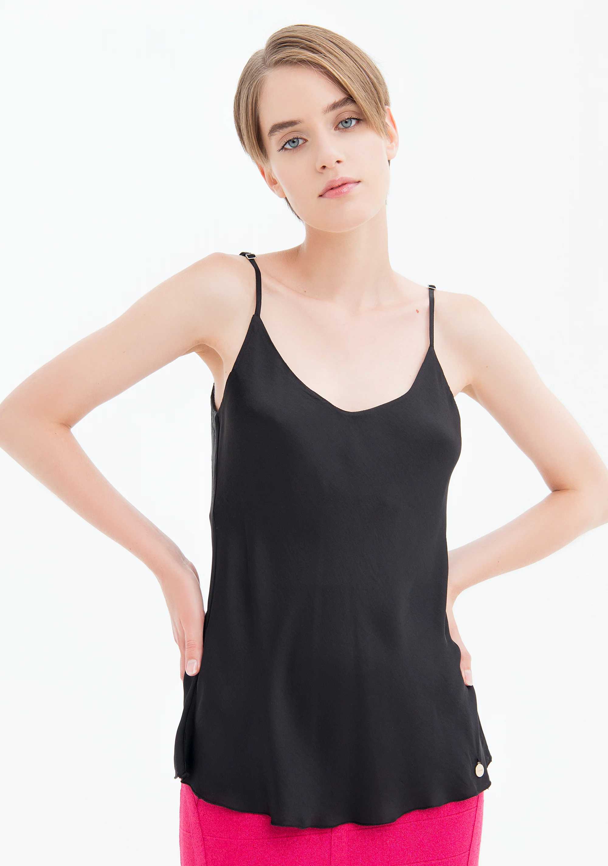 Top senza maniche in viscosa, scollo a V con bretelline sottili, e con fondo svasato.