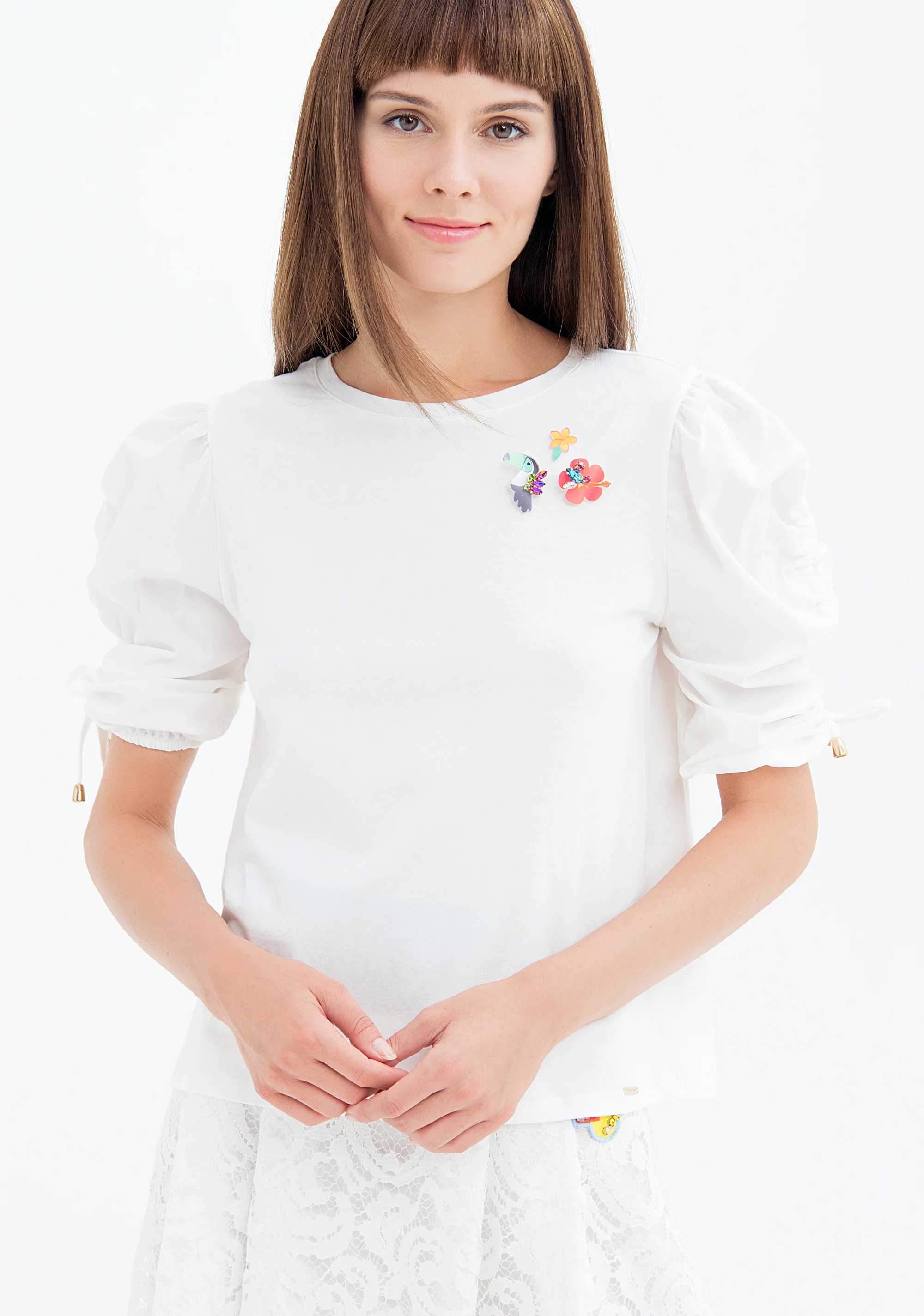 T-shirt regular in jersey, girocollo, applicazioni luminose su lato sinistro, e con maniche a sbuffo corte con coulisse sul lato.