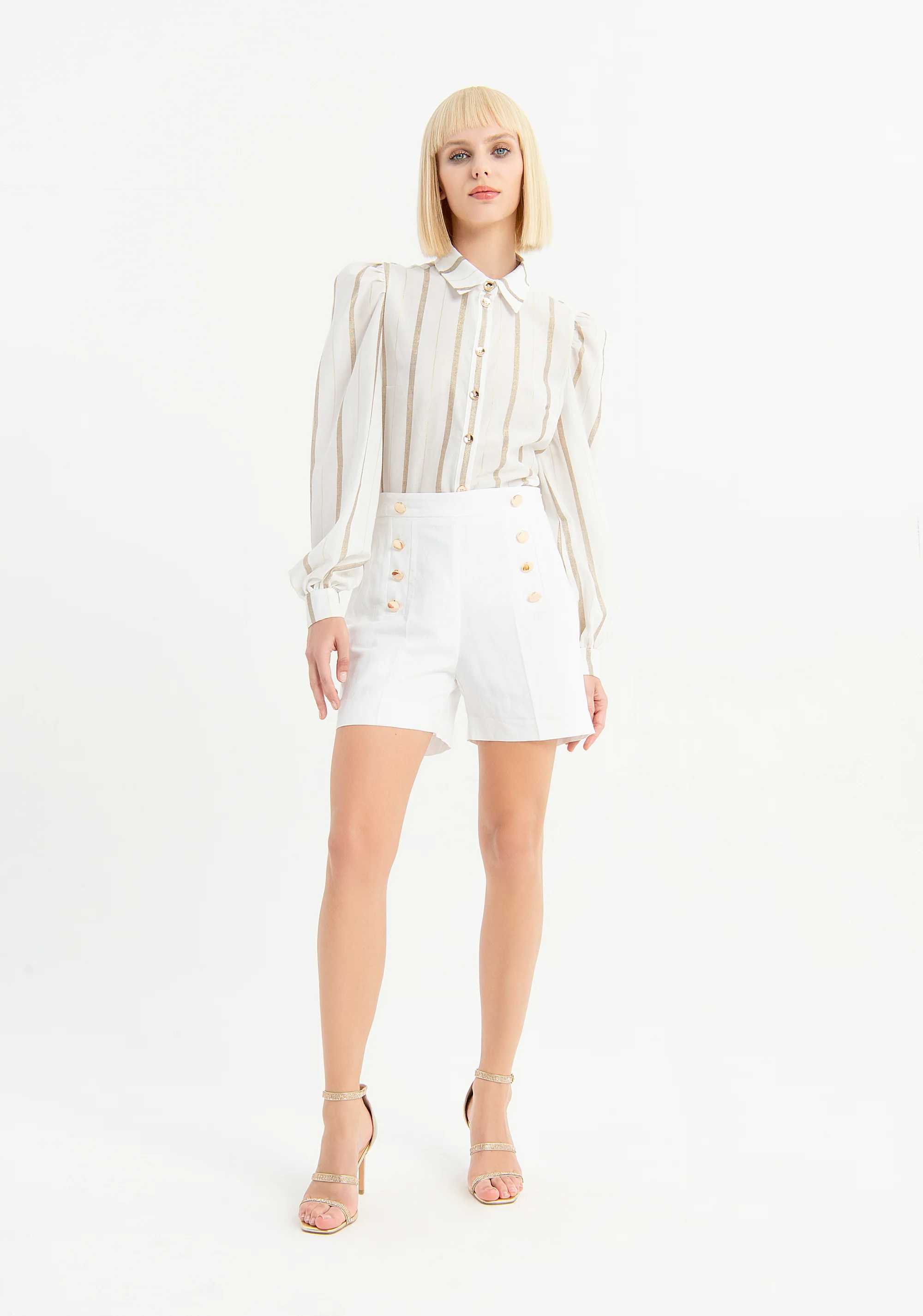Shorts vita alta misto lino con bottoni in oro