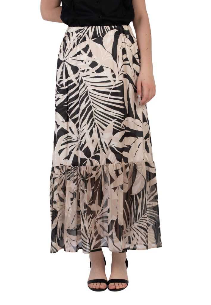 Gonna donna lunga svasata in tessuto leggero con un elegante design a fantasia. Perfetta per un look estivo e leggero, questa gonna garantisce comfort e stile grazie alla sua leggerezza e alla sua morbidezza. Ideale per ogni occasione, dal lavoro alle serate fuori.