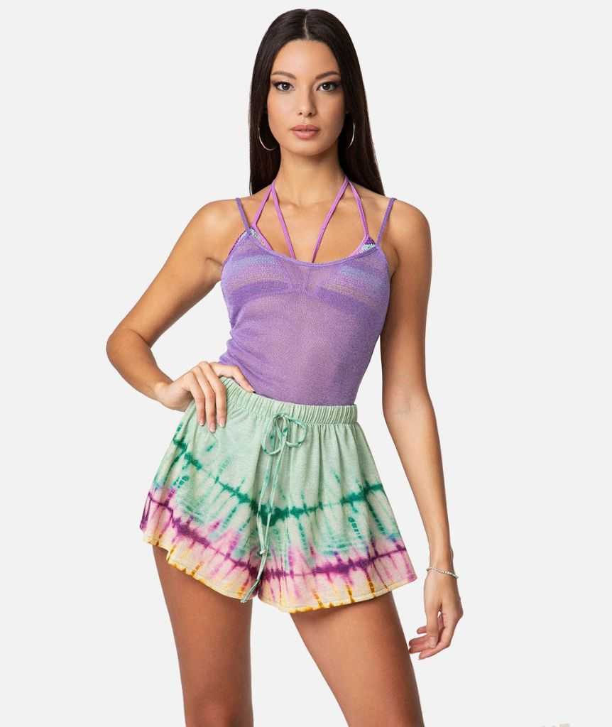 Shorts realizzato in maglina lurex a fantasia. vita elasticizzata con coulisse.