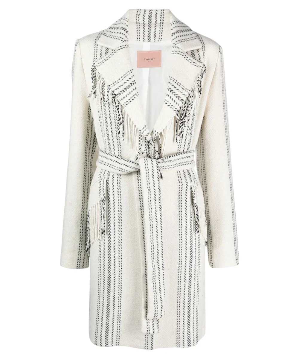 Cappotto in Misto Lana Jacquard con Frange - Riga Neve / Nero Frange Eleva il tuo stile invernale con il nostro cappotto monopetto in misto lana jacquard. Realizzato con tessuto italiano di alta qualità lavorato su telai artigianali, questo cappotto è un vero capolavoro di artigianalità e design. Le frange ritorte direttamente dal telaio e il motivo a righe piazzate, disegnato esclusivamente per Twinset, aggiungono un tocco distintivo. La sua linea dritta, il collo con revers e le tasche con patta lo rendono perfetto sia per occasioni speciali che per la vita di tutti i giorni. La cintura abbinata offre versatilità e stile, permettendoti di personalizzare il tuo look. Caratteristiche Principali: Tessuto italiano di misto lana jacquard di alta qualità Dettagli distintivi con frange ritorte e motivo a righe piazzate Chiusura con bottoni e cintura abbinata per una vestibilità personalizzata Foderato per comfort e durata Placchetta logo Oval T sul retro come segno distintivo Colore: Riga Neve / Nero Frange Modella alta 178 cm indossa la taglia XS/40 Composizione: 52% acrilica, 36% lana, 8% poliestere, 4% altre fibre. Fodera e dettagli con la stessa composizione.