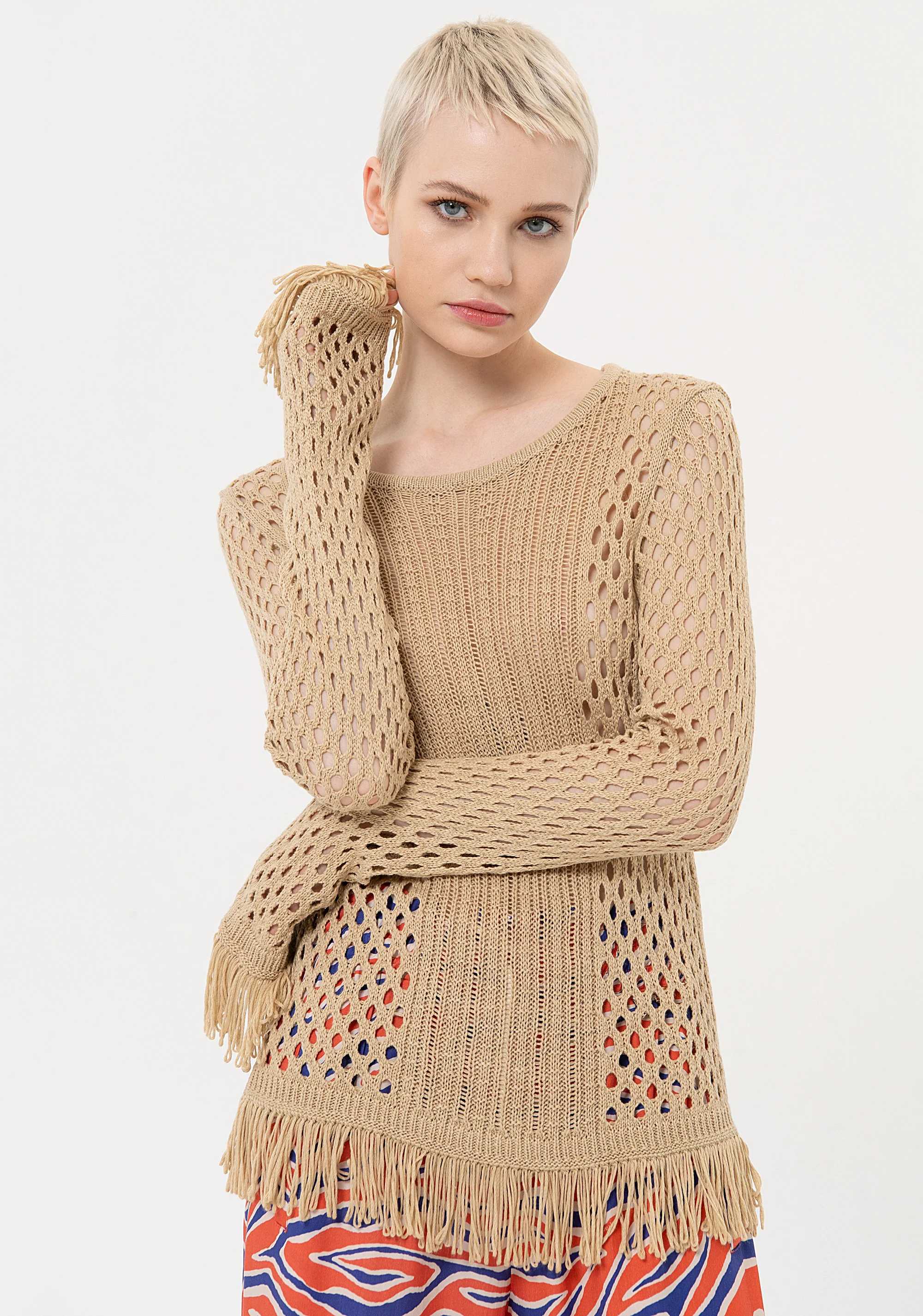 Maglia regular con punto rete, girocollo, schena scoperta, maniche lunghe, e con frange sul fondo.
