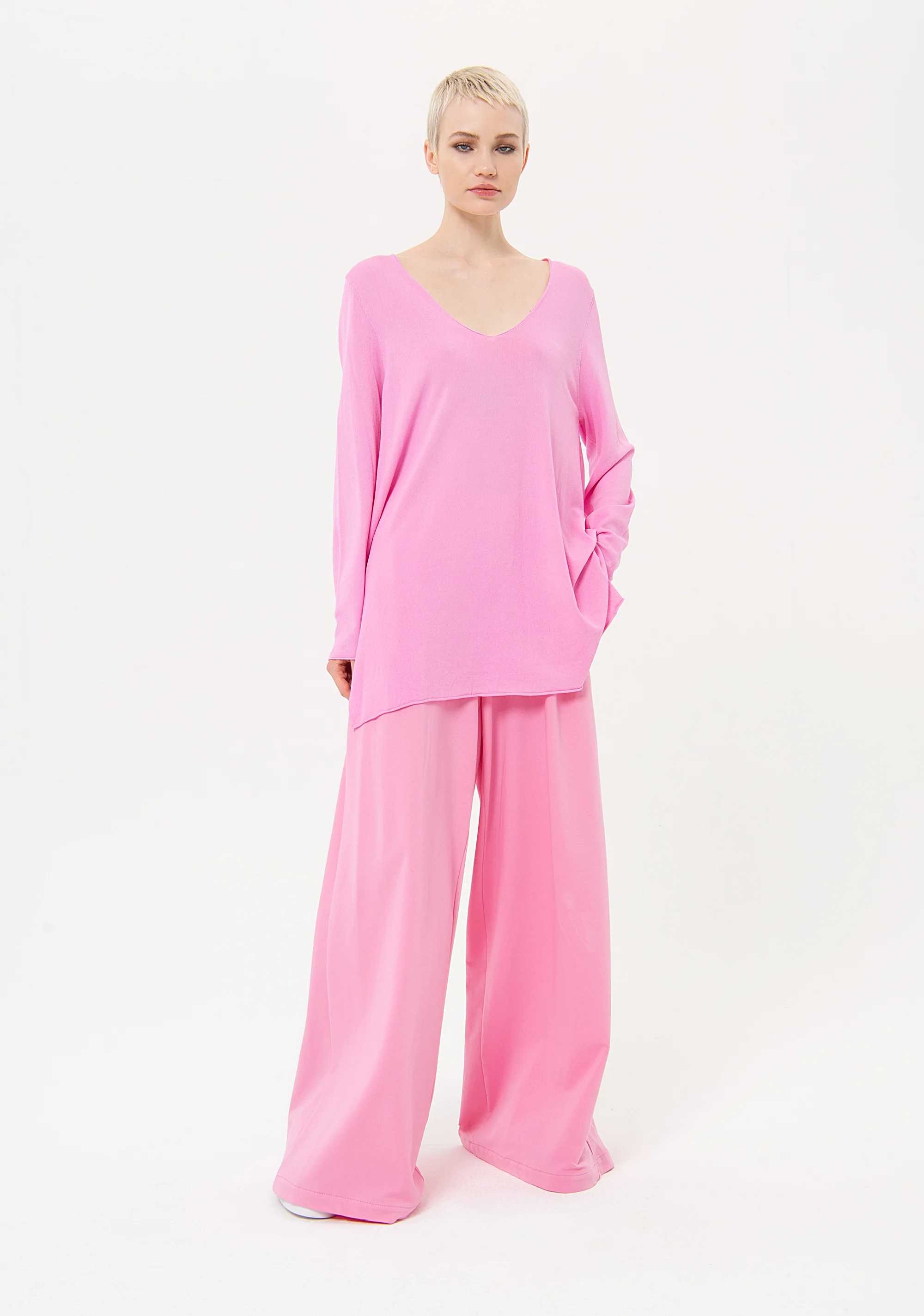 Maglia ampia lunga con viscosa, scollo a V, spacchi laterali, e con maniche lunghe.