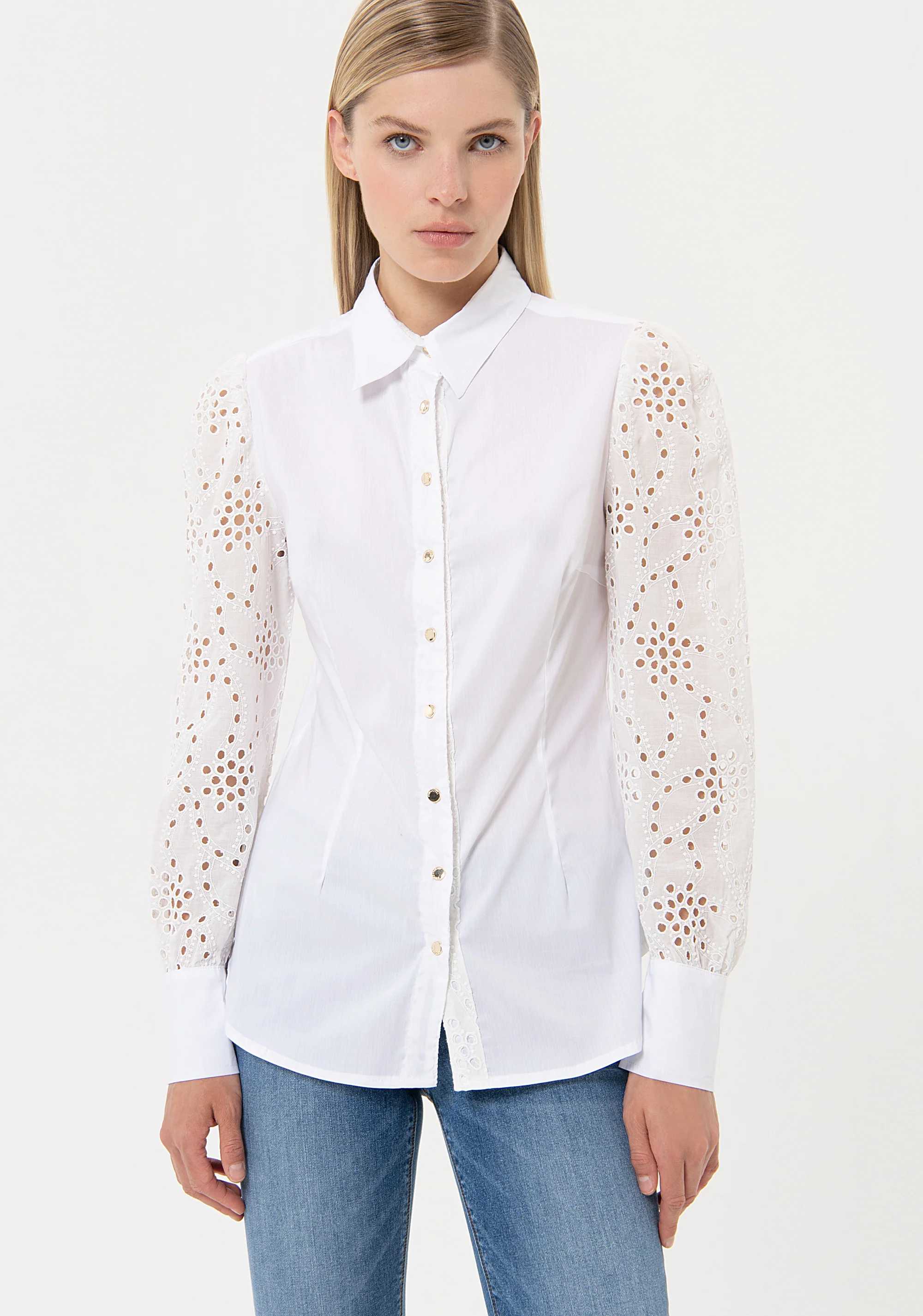 Camicia regular con maniche lunghe in pizzo San Gallo, colletto classico, e con bottoni centrali per apertura.