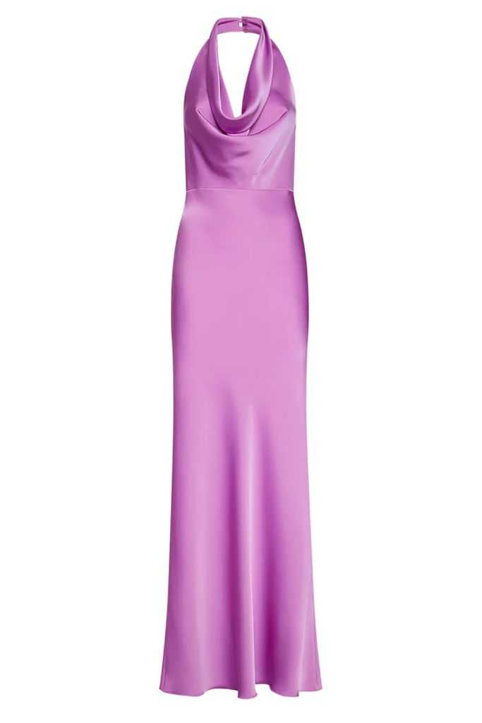 SIMONA CORSELLINI Abito lungo in satin pesante con scollo all'americana, svasato sul davanti. L'apertura posteriore termina con un torchon metallico con strass. Altezza modella: 178 cm - Taglia indossata IT40