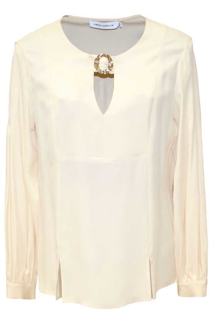 SIMONA CORSELLINI Camicia in misto seta colore avorio manica lunga con scollatura con dettaglio cutout sul davanti e accessorio colore oro. Manica con polsino. Spacchetto sul fondo della camicia.