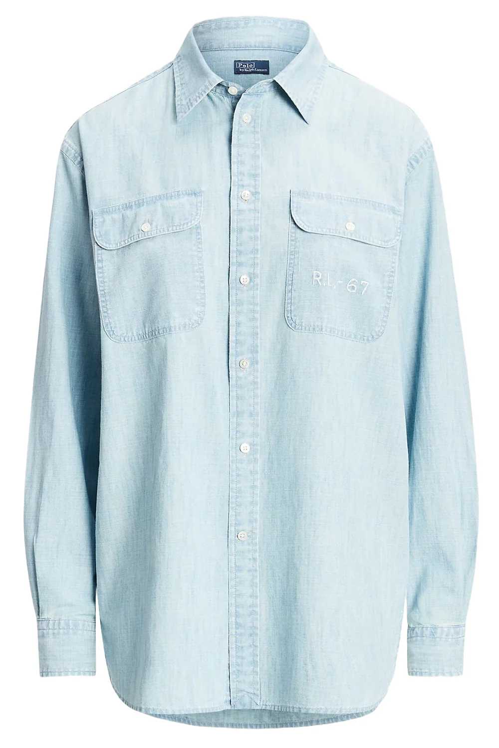 POLO RALPH LAUREN Camicia in cotone chambray colore azzurro con logo frontale e sul retro ricamato. Collo ampio. Cannoncino con bottoni. Maniche lunghe con polsini con bottoni. Due tasche con bottone applicate sul torace. Carré posteriore. Lembo orlato più lungo sul retro. Ricamo con scritta "RL Quality Goods 1967 New York" a punto catenella e bandiera americana sul retro. La modella è alta 178 cm e indossa la taglia S.