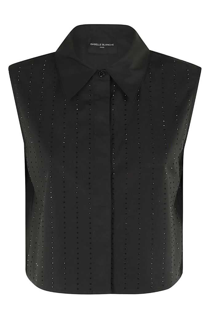 ISABELLE BLANCHE Camicia giromaniche con colletto dritto in cotone colore nero. Applicazioni strass all over. La modella indossa la taglia S-40 taglia italiana ed è alta 176 cm