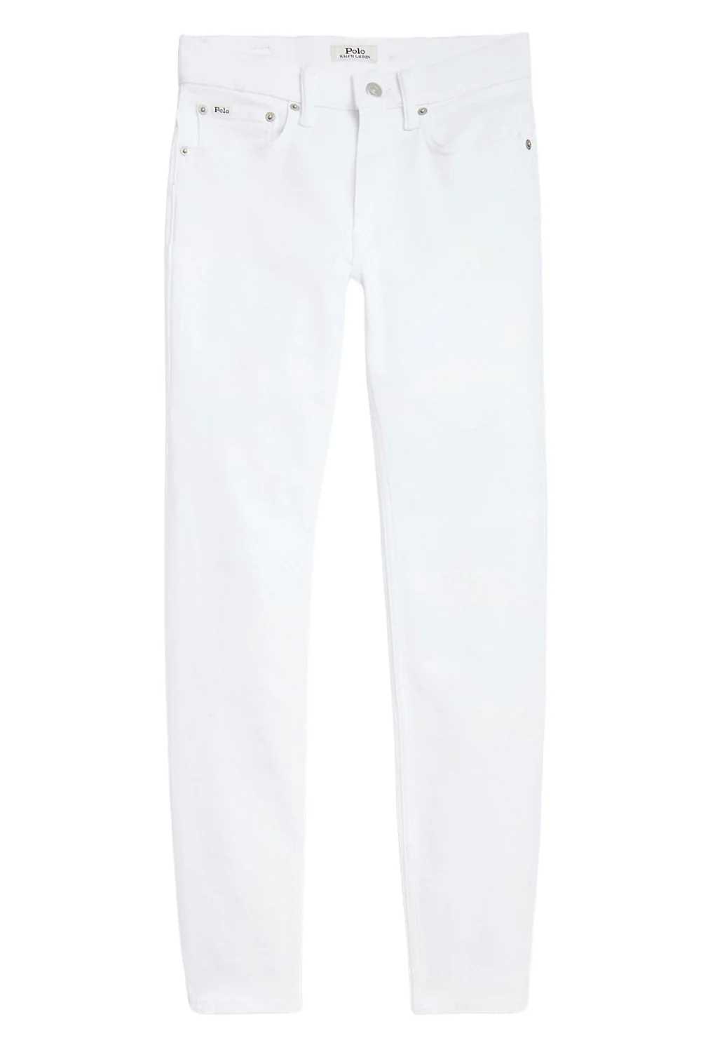 POLO RALPH LAUREN Jeans Super Slim-Fit a vita media colore bianco, passanti per cintura e patta con zip e bottone. Modello cinque trasche con rivetti in metallo con scritta "P.R.L. 67" incisa. Applicazione "Polo" sul taschino. Esclusiva applicazione in pelle con scritta "Polo Ralph Lauren" sul retro. La modella è alta 178 cm e indossa la taglia IT 26. 96% cotone, 3% poliestere, 1% elastan.