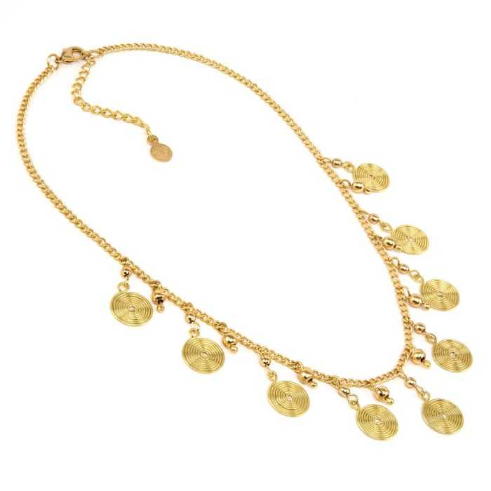 Collana in ottone con spirali pendenti. Chiusura con moschettone. Nickel tested. Lavorazione artigianale.