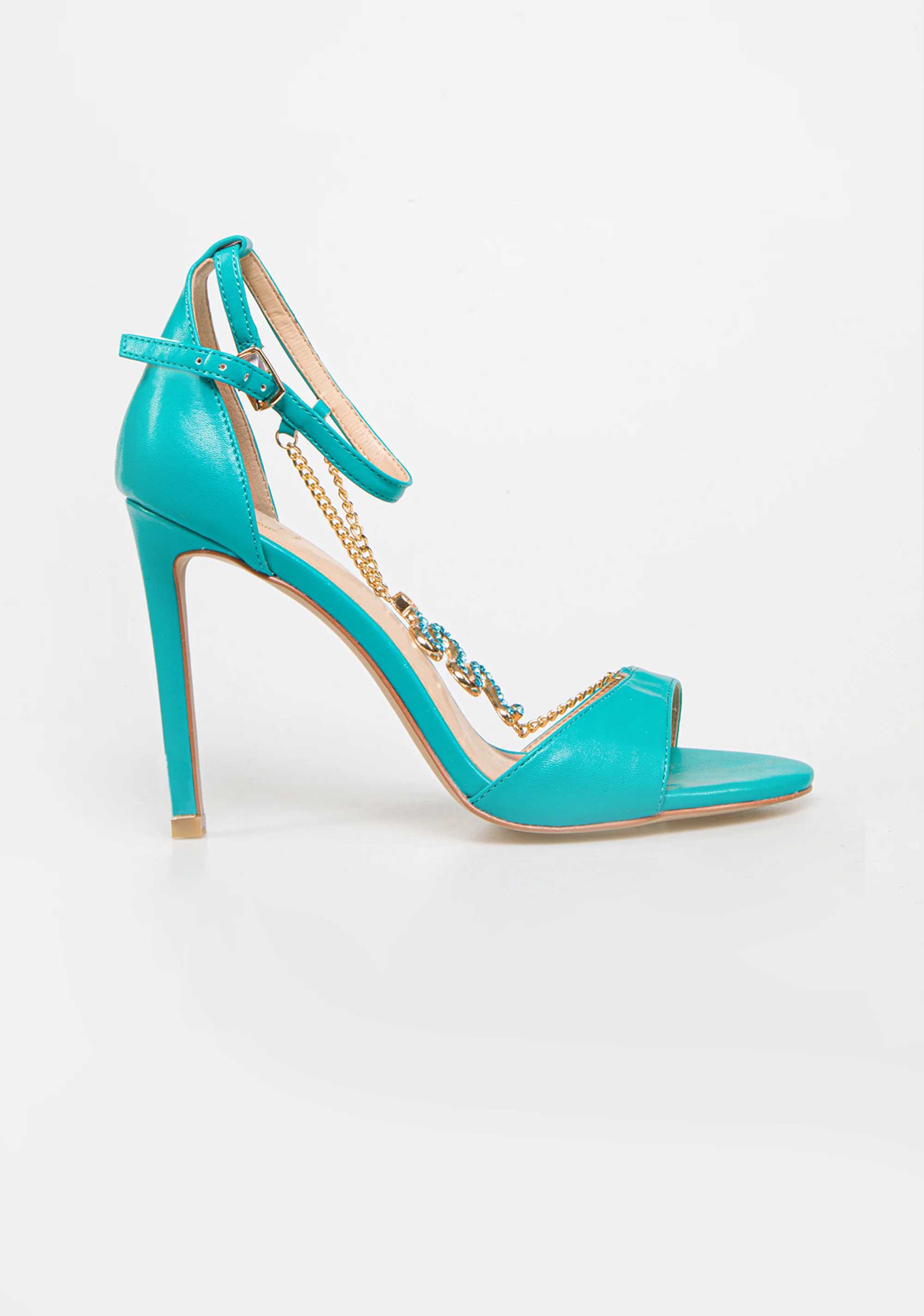 Sandali con tacco sottile, gioiello applicato e con allacciatura alla caviglia.