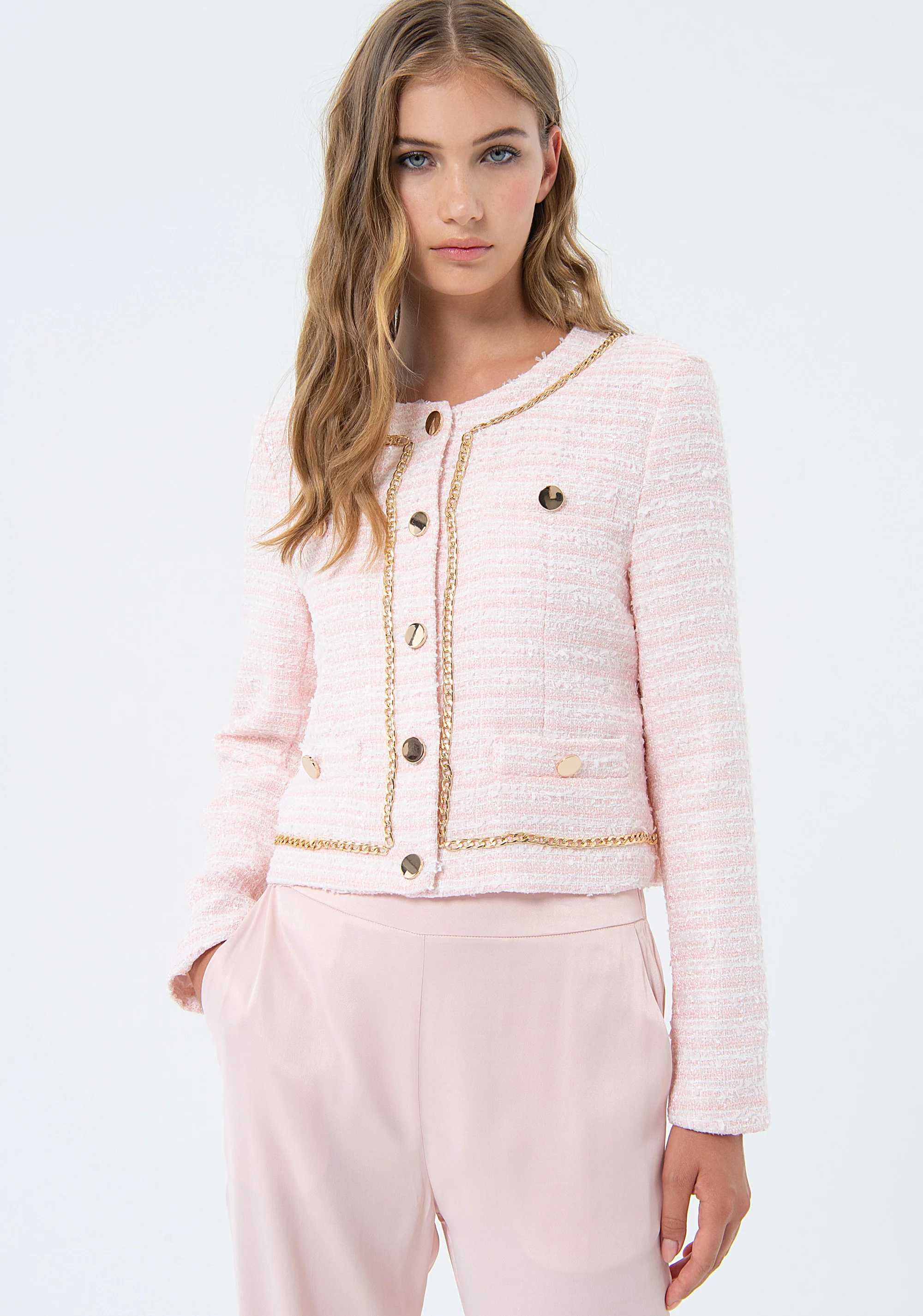 Giacca linea diritta in tweed, girocollo con bottoni centrali per apertura, inserti di catene, e con maniche lunghe.