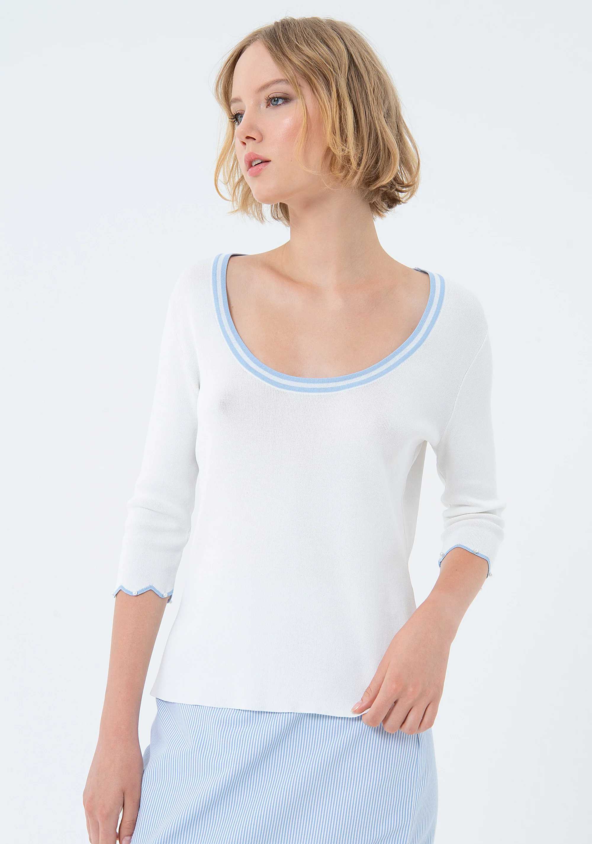 Top slim con scollo tondo, e con maniche a 3/4 con orlo smeralato.