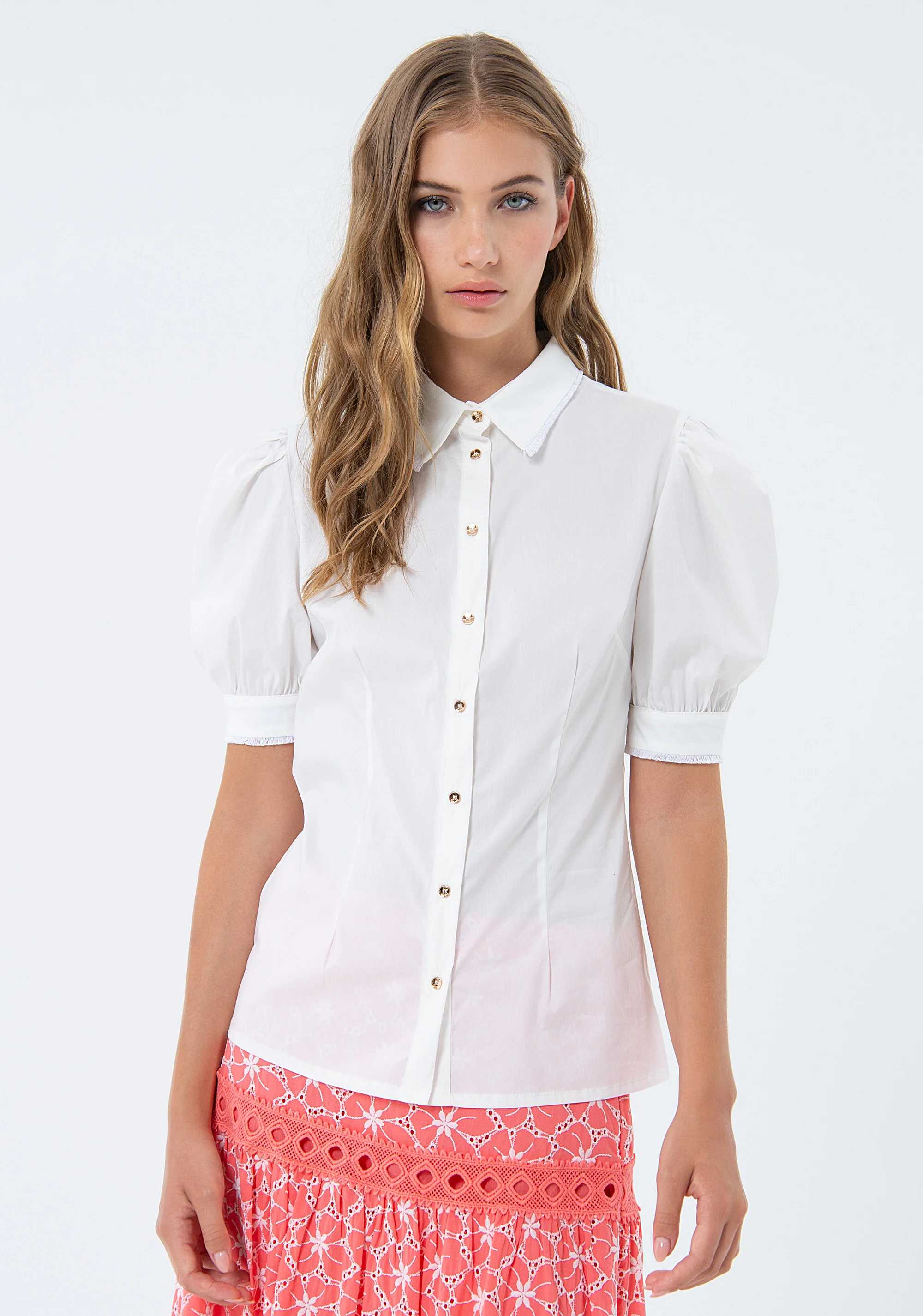 Camicia regular in popeline, colletto classico, bottoni centrali per apertura, e con maniche corte a palloncino.SHELL: COTTON 70% POLYIMIDE 26% ELASTANE 4%La modella è alta 175 cm e indossa una taglia SMALL