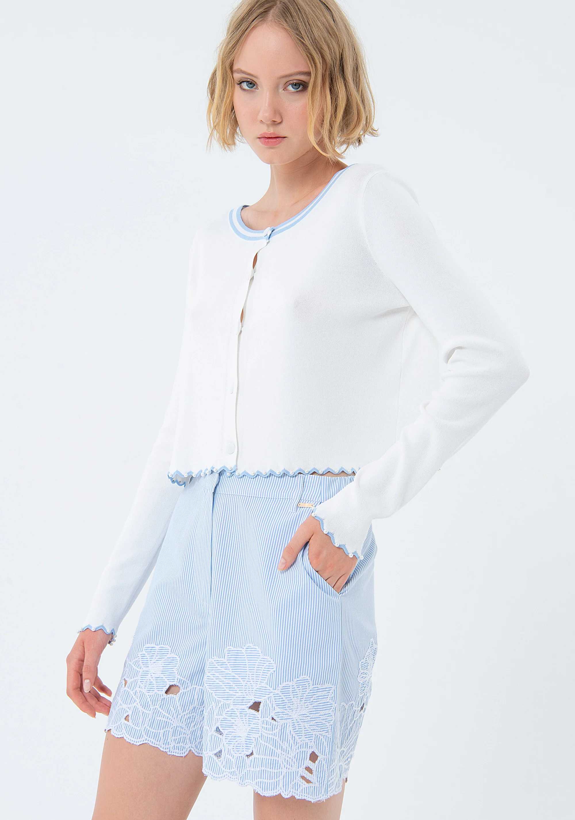Cardigan regular con maniche lunghe, girocollo, bottoni centrali per apertura, e con smerlo sul fondo.