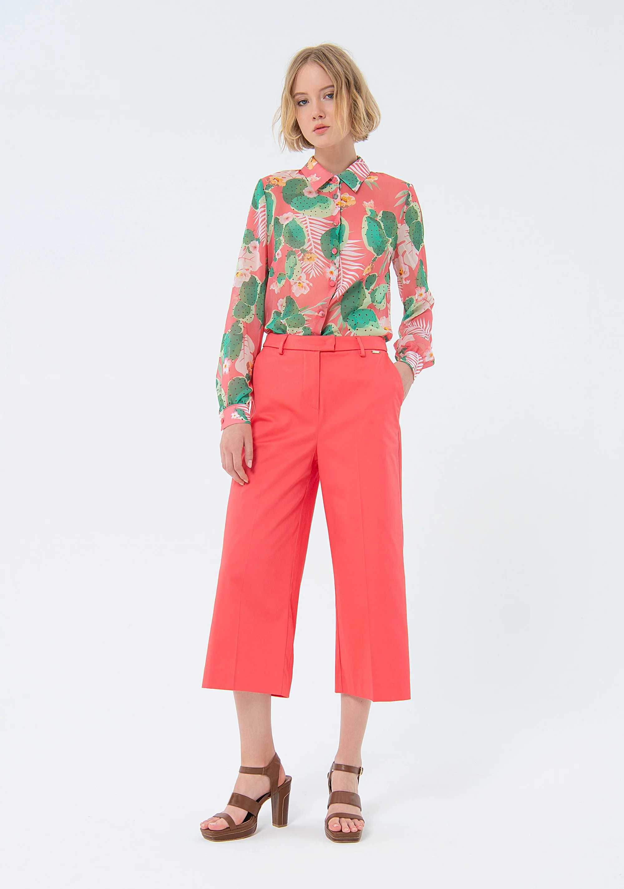 Pantaloni cropped culotte in cotone, vita regolare, tasche alla francese sui fianchi, e con fondo largo.