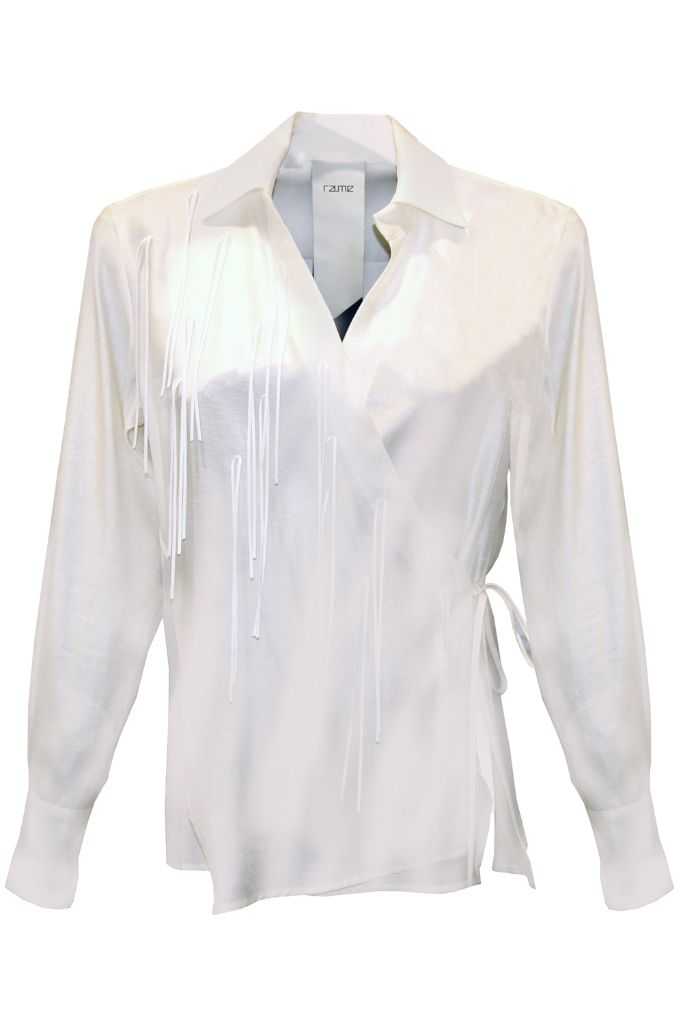RAME Camicia in misto lyocell e lino colore bianco avorio. Chiusura incrocio sul davanti con frangette applicate. Spacchi laterali, manica lunga e scollo a V. 71% lyocell 16% poliestere 13% lino