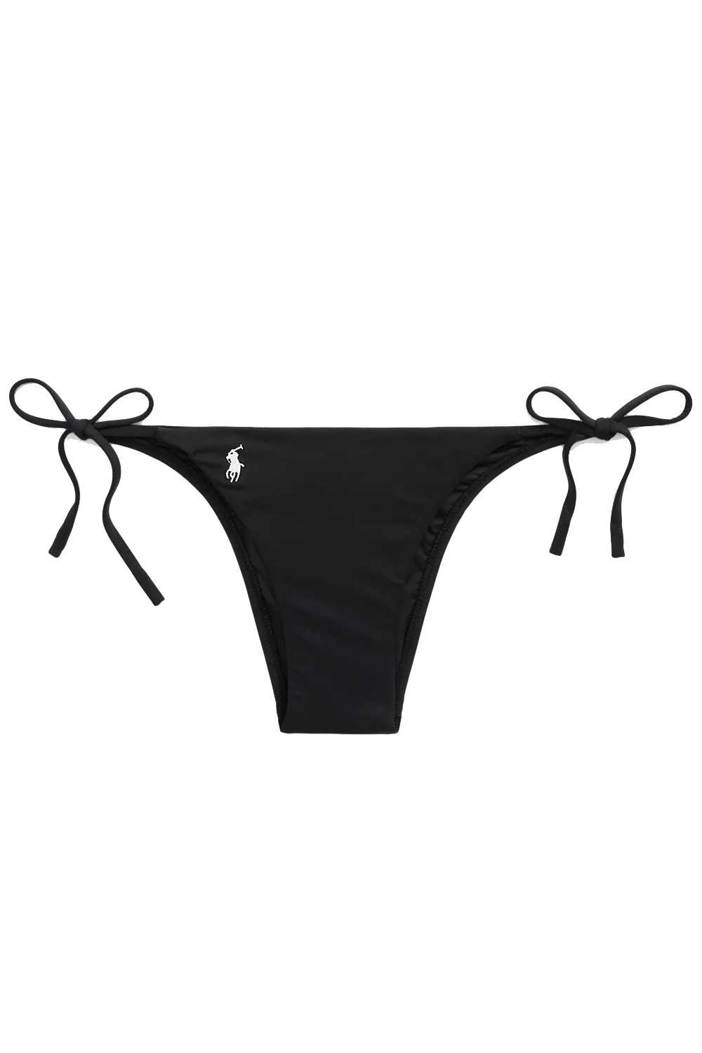 POLO RALPH LAUREN Slip da bikini con nodi laterali in nylon elasticizzato colore nero con iconico pony ricamato sul lato in bianco La modella è alta 178 cm e indossa la taglia S.