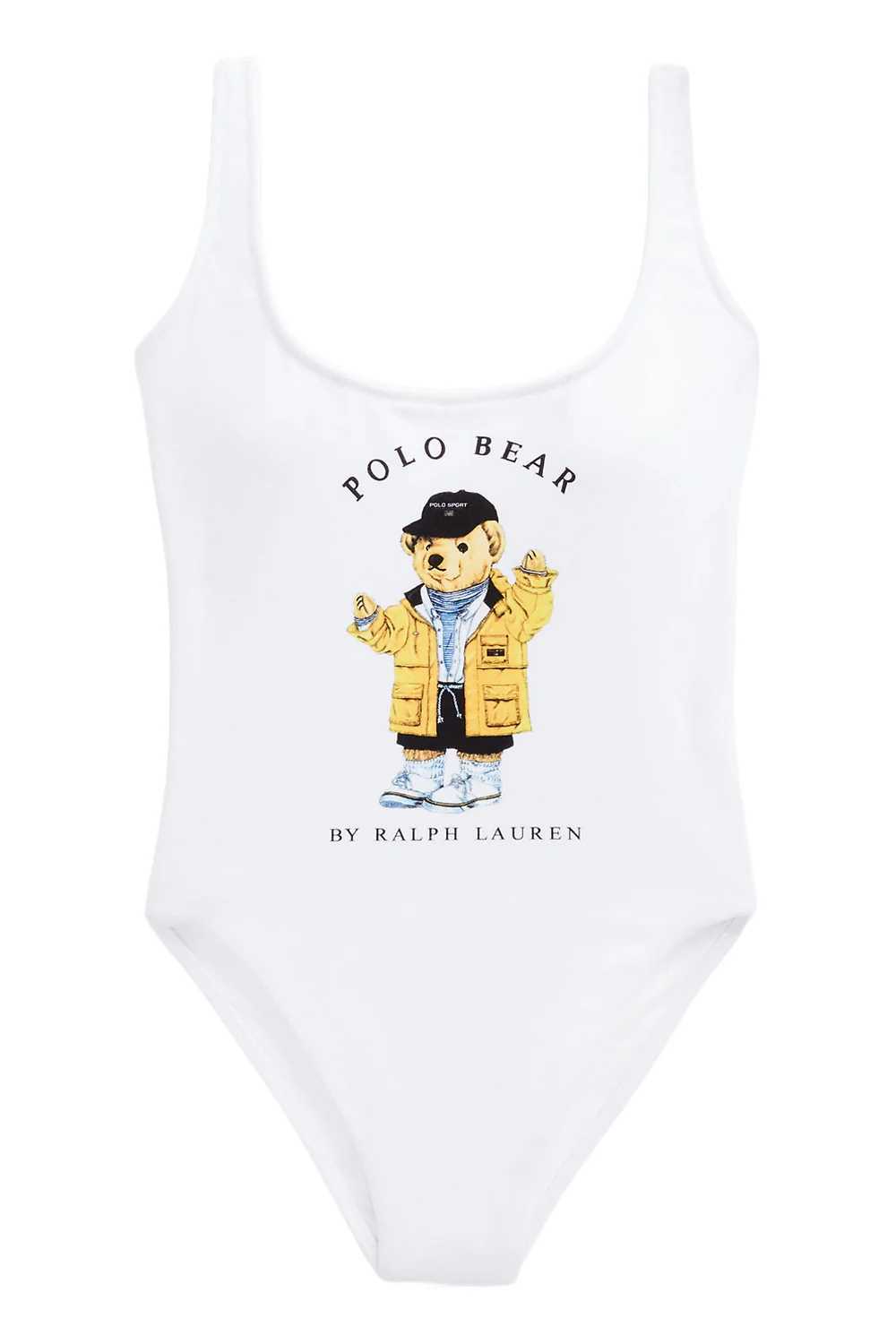 POLO RALPH LAUREN Costume modello intero colore bianco con stampa frontale Polo Bear by Ralph Lauren, interamente foderato. Scollo rotondo e sgambatura classica con copertura cheeky nella parte posteriore. La modella è alta 178 cm e indossa la taglia S.