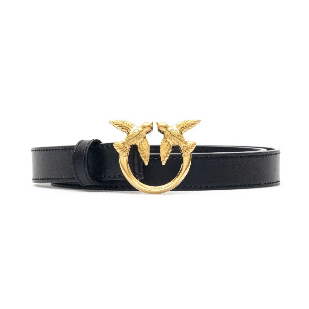 Cintura in pelle liscia, caratterizzata dalla fibbia a perno Love Birds in metallo finitura oro anticato.