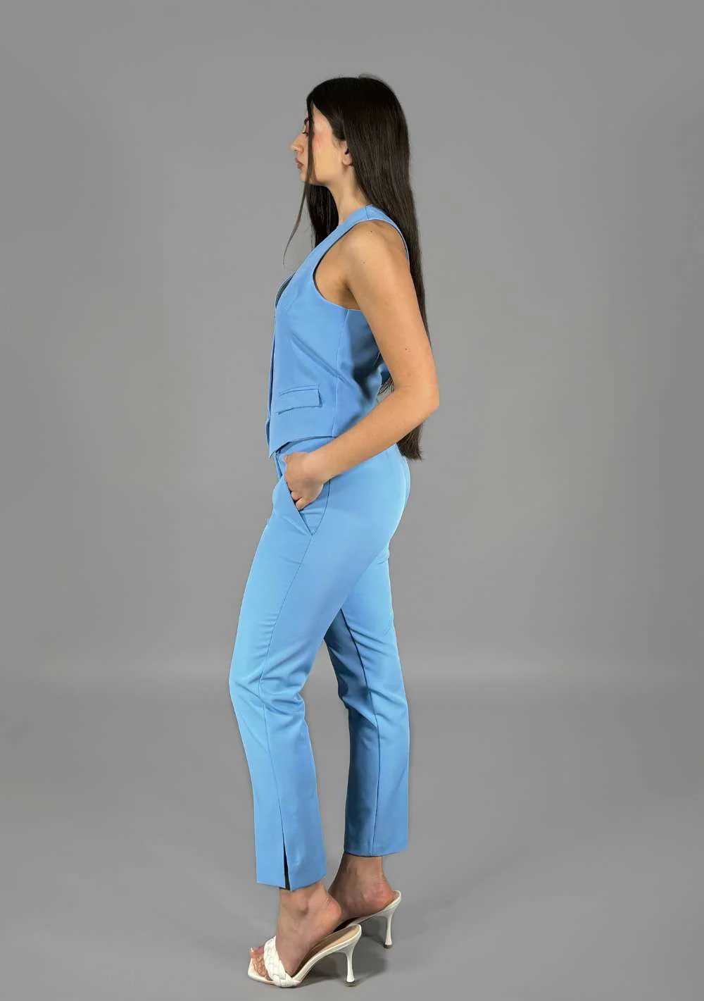 Pantaloni modello stretto, realizzati in poliviscosa; tasche alla francese. Chiusura con doppio bottone e zip nascosta. Il pantalone presenta gli spacchi laterali. Completa il tuo outfit con il gilet realizzato nello stesso tessuto, come in foto. Composizione: 90% Poliestere, 10% Spandex Vestibilità: Slim Stagione: Primavera / Estate Modella: La modella è alta 175 cm ed indossa la taglia M