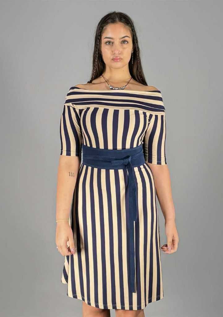Abito shiffer rigato, mezza manica, realizzato in viscosa elasticizzata, per conferire una vestibilità perfetta. L'abito può essere indossato con una fusciacca in vera pelle come in foto.Fusciacca non inclusa. Composizione: 95% Viscosa, 5% Elastomero Vestibilità: Regular Stagione: Primavera / Estate Modella: La modella è alta 173 cm ed indossa la taglia unica